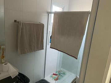 1 banheiro com box e gabinete,